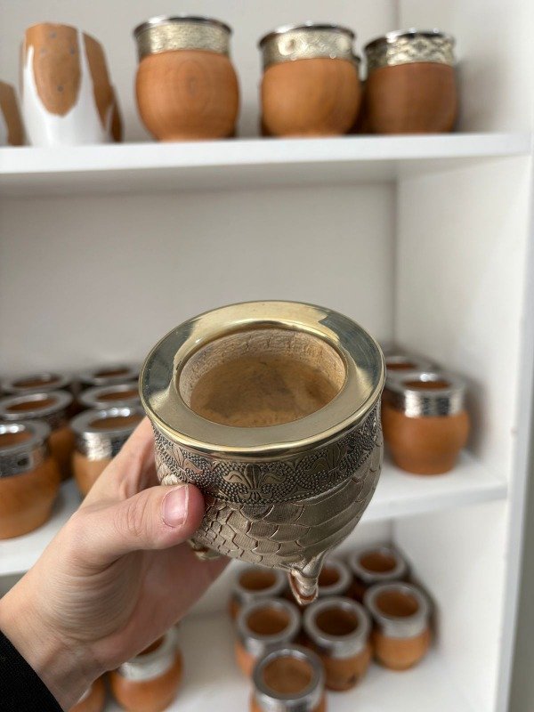 Un clásico que impone presencia. Este mate está forrado en doble cuero trabajado a mano, lo que refuerza su estructura y realza la intensidad de sus colores.