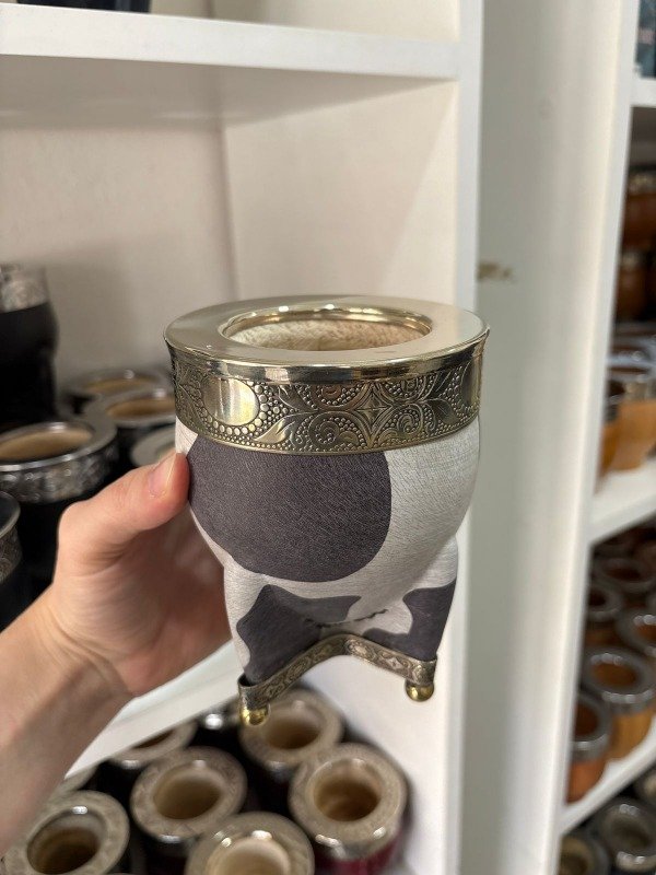Un mate único que combina tradición y tendencia. Su interior de calabaza conserva el sabor auténtico de cada cebada, mientras que la base de alpaca aporta elegancia y resistencia. El revestimiento en cuero diseño vaca lo convierte en una pieza distinta, llamativa y con mucho estilo, ideal para quienes buscan destacarse con un mate fuera de lo común.